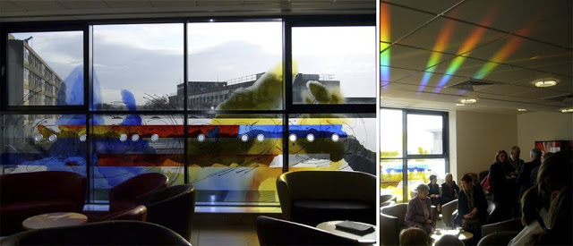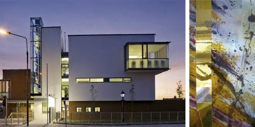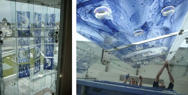 Welcome to the Glass Society of Ireland’s first artist profile, which takes a look at the work of Elke Westen. Elke began her studies in Germany at Fachochschule Dortmund and completed an MA in glass at NCAD in 2002. She has lectured at NCAD, National University Bogotá, Columbia and University “Hildesheim”, Germany and has won a number of architectural commissions in Ireland, such as Carlow Credit Union (pictured below), Carlow, Letterkenny Inistitute of Technology, Donegal, Irishtown Garda Station (pictured above), Dublin and Ulster Hospital Renal Unit, Belfast (pictured below). She has also been directly commissioned to make work for a number of State buildings, such as the Department of Education and Science and the Department of Social and Family Affairs. For more information on Elke and her work, visit her new website, www.elkewesten.com