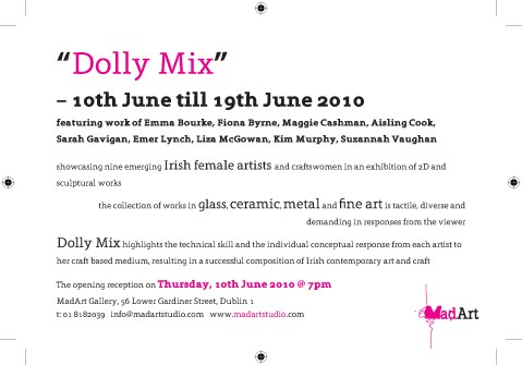 The work of glass artists Fiona Byrne, Emma Bourke, Emer Lynch, Maggie Cashman, Aisling Cook and Suzannah Vaughan will feature alongside the work of Sarah Gavigan, Kim Murphy and Lisa McGowan in “Dolly Mix”, an exhibition opening in the Mad Art Gallery, Lower Gardiner Street, Dublin 1 on the 10th June and running until the 19th June.