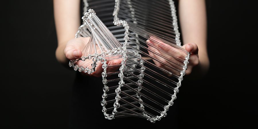 Quinn focuses her design process on human centred design and engineering. This allows glass, a fragile material, to become malleable. She uses the possibilities of 3D printing to navigate the difficulties in joining glass pieces. In particular this can be seen in Quinn’s wearable glass designs, where individual glass components are in motion both individually and as a whole. This attention to the engineering detail leads to the development of a relationship between the glass and the owner. Developing the perfect joining components can be an ever evolving process. In a seminal experience whilst studying under Dr. Caroline Madden at NCAD Quinn was advised: