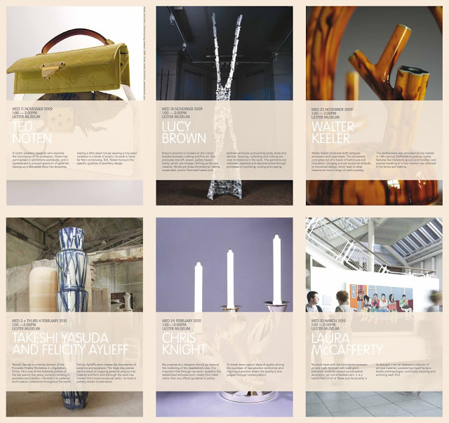 Organised by the Applied Arts Ulster group, masterclasses are a yearly programme of internationally recognised artists of ceramics, silver + jewellery and textile art visiting Northern Ireland for two days. Click on the images to open in a new window and download.